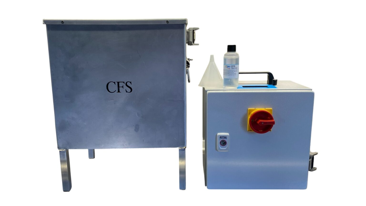 Het decontaminatiemiddel wordt geleverd in plastic flesjes, afgevuld met de benodigde hoeveelheid per cyclus. Hiermee dient de CFS Trident te worden gevuld.